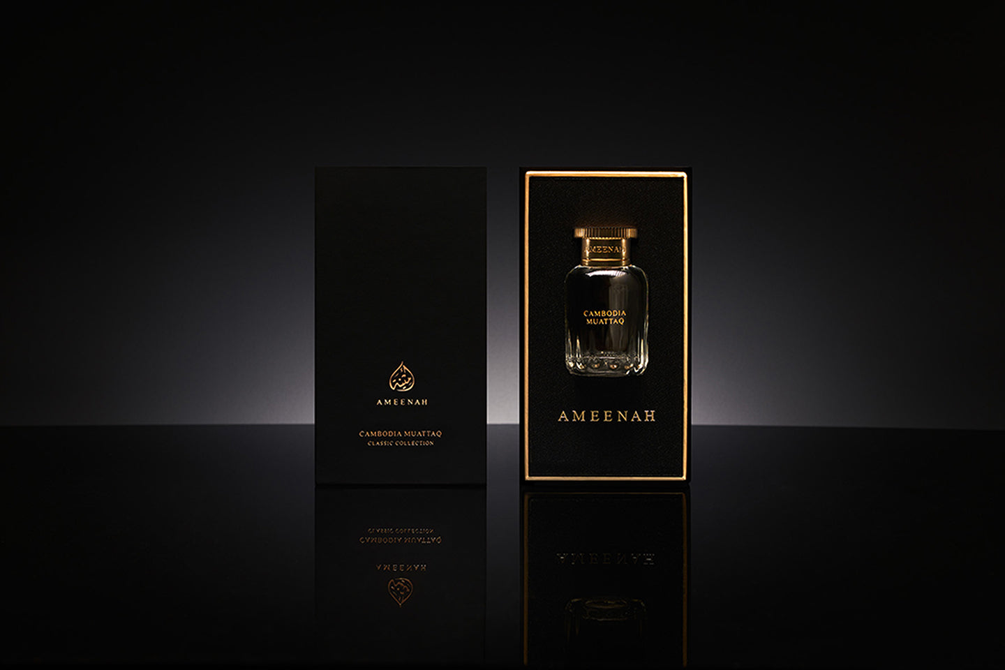 With its intense black background accentuated by prestigious golden highlights, Ameenah’s packaging represents the impeccable craftsmanship and luxurious detail of the products inside.