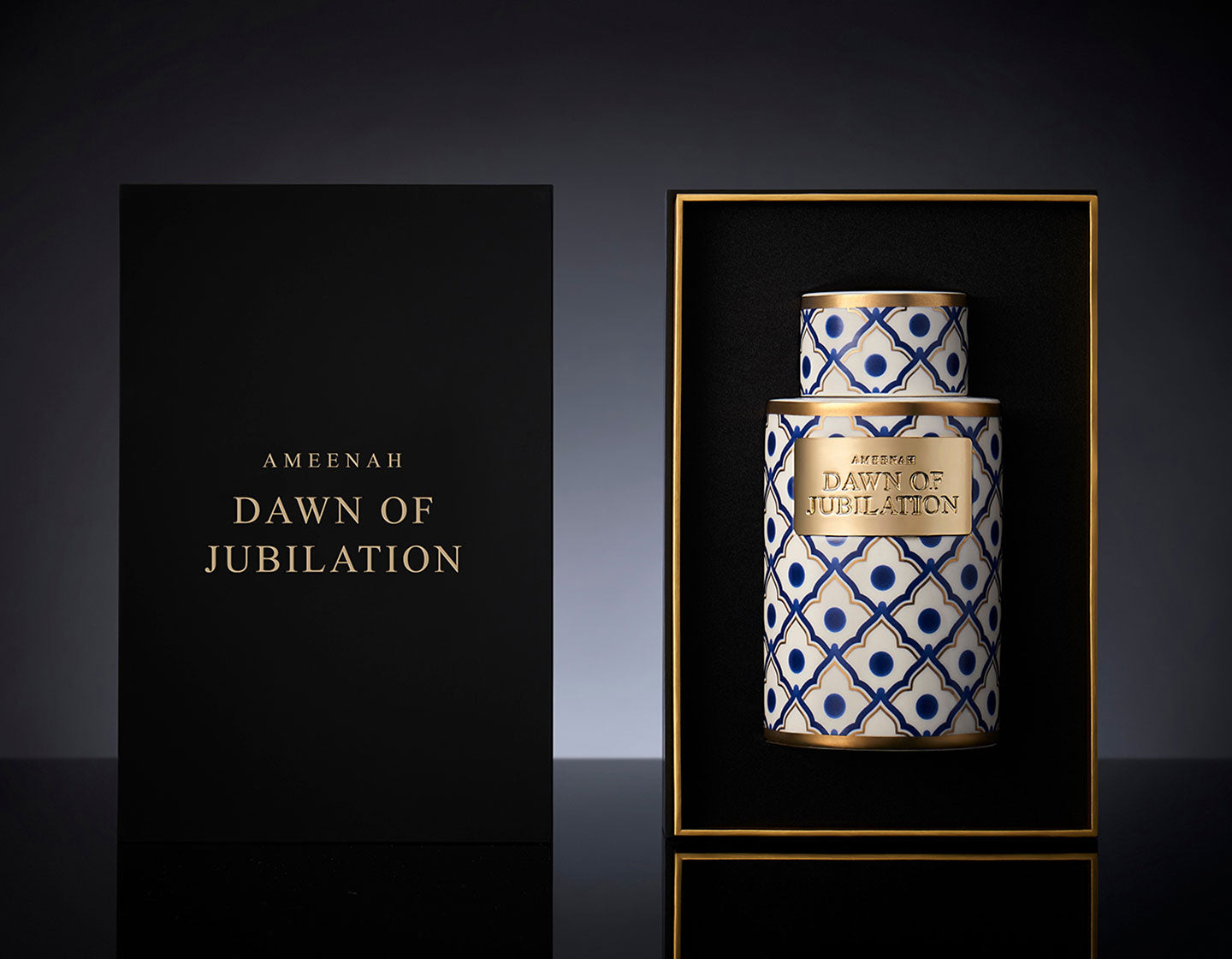 Ameenah的包装设计以深邃的黑色为背景,点缀华贵的金色细节,彰显出其产品一贯秉承的卓越工艺与奢华格调。