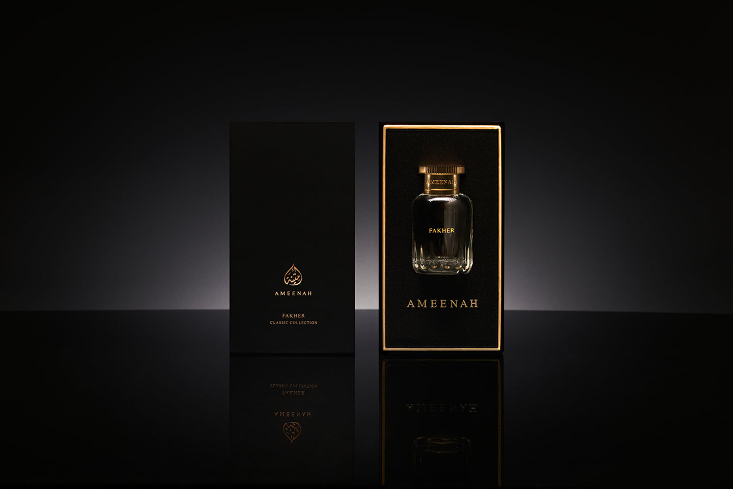 With its intense black background accentuated by prestigious golden highlights, Ameenah’s packaging represents the impeccable craftsmanship and luxurious detail of the products inside.
