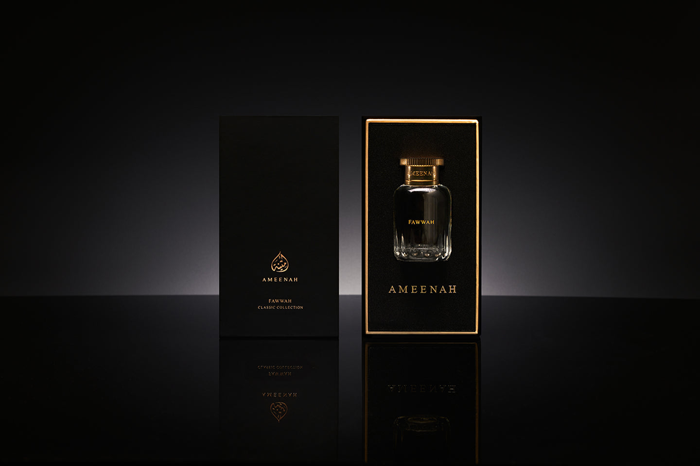 With its intense black background accentuated by prestigious golden highlights, Ameenah’s packaging represents the impeccable craftsmanship and luxurious detail of the products inside.