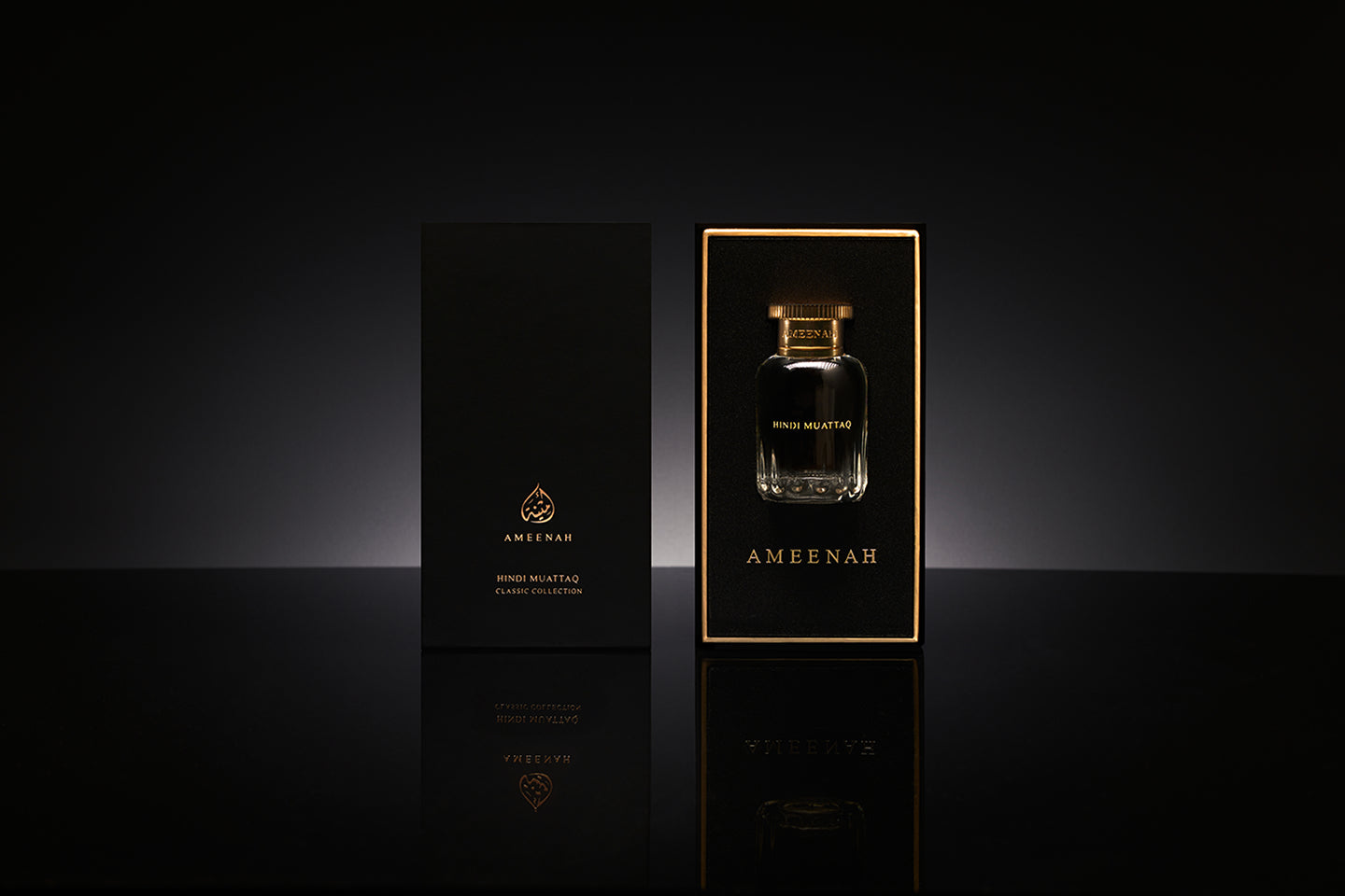 With its intense black background accentuated by prestigious golden highlights, Ameenah’s packaging represents the impeccable craftsmanship and luxurious detail of the products inside.