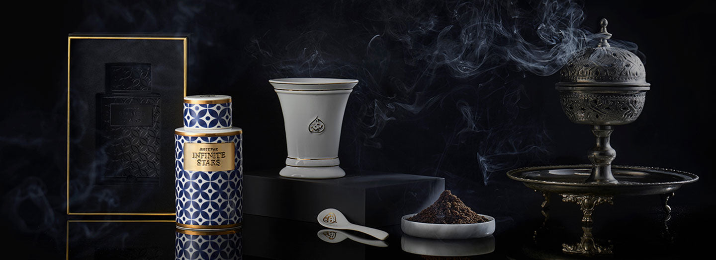 Just such a sight, savored on a pitch dark night over the peaks of distant mountains, inspired this incense powder. Here is a starburst painted with fragrances, at its outer edges the luster of rich, ripe fruit and warm spice. Simultaneously, closer to the core, we sense more expansive characters, as Ameenah Oud mingles with rose and Shamama conjures the verdancy of Eastern forests. Exhilaration sets in, and a flurry of warm, musky and amber tones completes the celestial array. As we wonder at the multitude, we sense its harmony, too, and an enveloping peace. So we are loaned a fragment of the stars’ infinity. And it will never leave us, whatever daybreak brings.