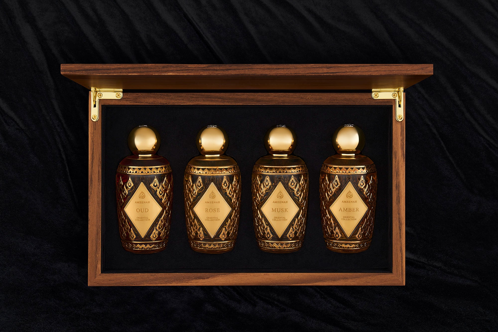 Die vielschichtige Gestaltung in Kombination mit hochwertigen Materialien zollt Ameenahs Tradition des meisterhaften Handwerks und des feinsten Oud höchsten Respekt.