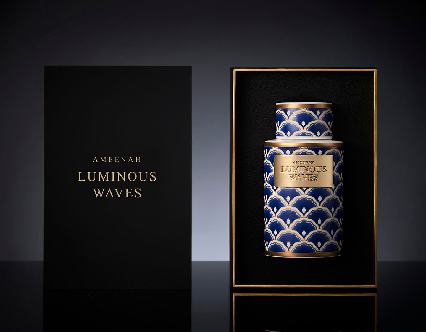 With its intense black background accentuated by prestigious golden highlights, Ameenah’s packaging represents the impeccable craftsmanship and luxurious detail of the products inside.