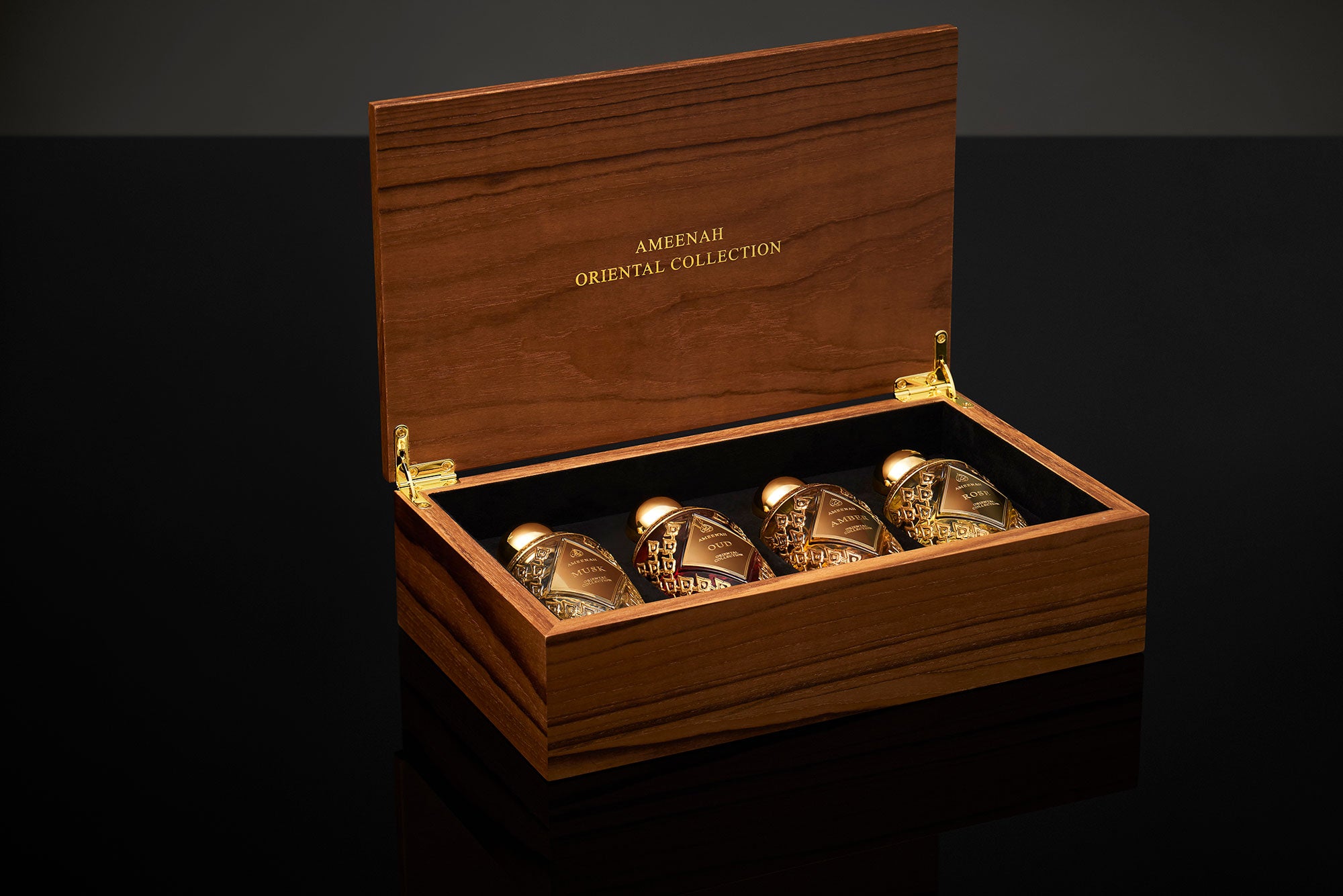 With its intense black background accentuated by prestigious golden highlights, Ameenah’s packaging represents the impeccable craftsmanship and luxurious detail of the products inside.